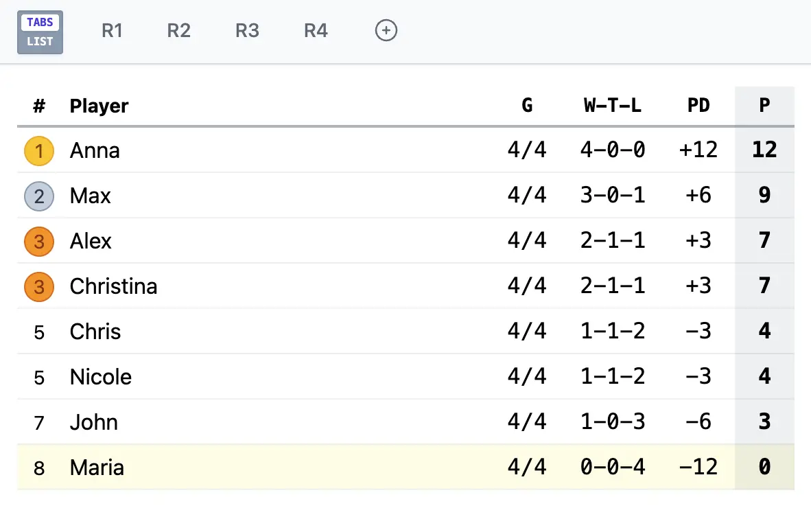 Run the format that fits your competition — without workarounds or manual adjustments. From single and double elimination brackets to round robin, Swiss system tournaments and full league seasons with automatic standings, everything is supported in one flexible platform. Configure your structure in seconds and scale from a quick knockout event to a full season with ease.