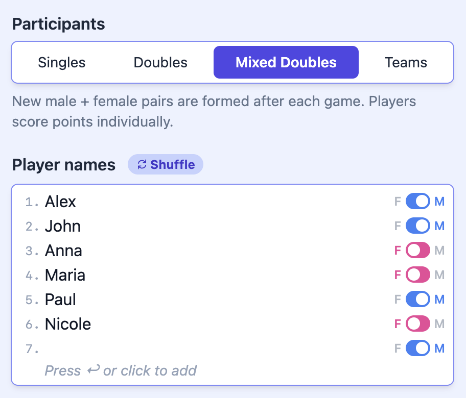 Add, edit or remove participants at any time. Import teams from previous seasons, update player lists and manage roster changes without breaking the structure of your tournament or league.