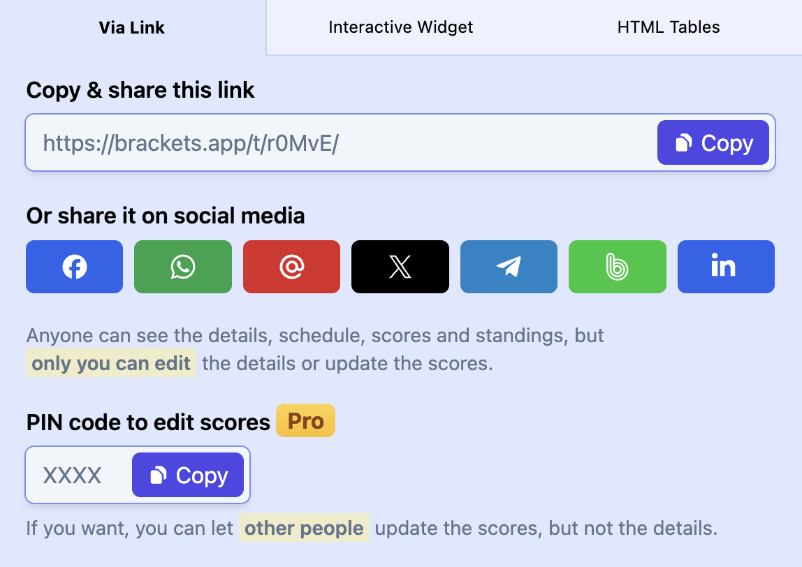 Share your tournament with players and spectators in real time.